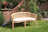 Plantation teak designed to be left outdoors all year round.Our thick cushions have zip fastenings to allow for easy removal for cleaning.Includes a woven polyester contemporary bench cream cushion (Ecru/Natural).Delivered fully assembled.Curved Contemporary Garden Bench made from Premium Teak. Our curved Contemporary Banana Bench is crafted in durable plantation teak.It is manufactured in the traditional manner with mortise and tenon joints and teak dowels and delivered fully assembled for your immediate enjoyment.With its graceful sweeping curved top rail, level seat and raked back for comfort the Contemporary provides the perfect focal point or design solution for gardens and architectural landscape settings.While conveying an unmistakable sense of presence and longevity it is equally at home in both contemporary and traditional settings.This bench is a lovely gift idea for a wedding anniversary, birthday, retirement or housewarming present.
